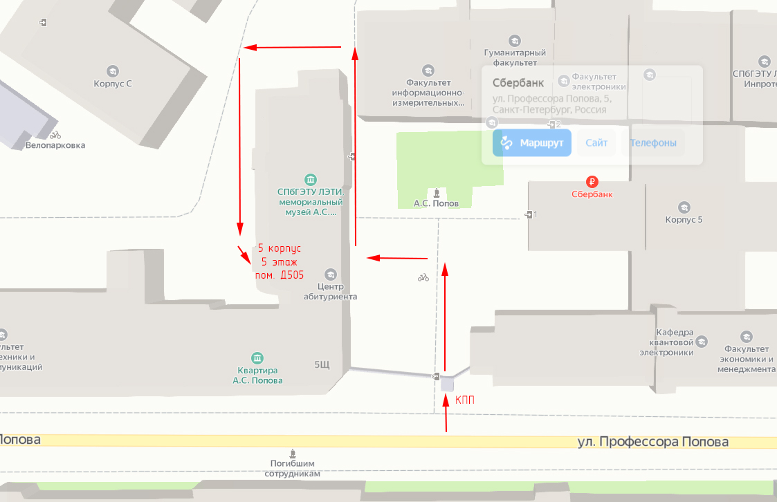 Ассоциация находится по адресу: Санкт-Петербург, ул. Профессора Попова, д.5 корпус "Д", 4-ый подъезд, 5-ый (последний) этаж, помещение Д-505. Ниже приведена схема прохода в радиоклуб АЛРС от центральной проходной университета.